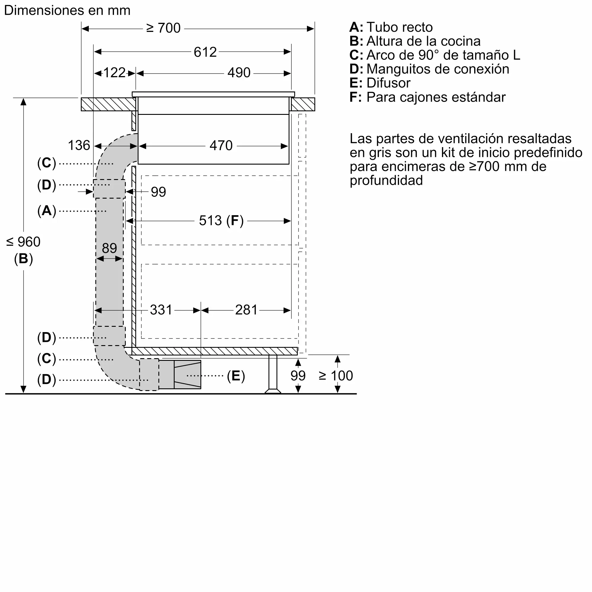 Kit de accesorios para instalación en recirculación, parcialmente canalizadas, para encimeras de profundidad de 70 cm o más.