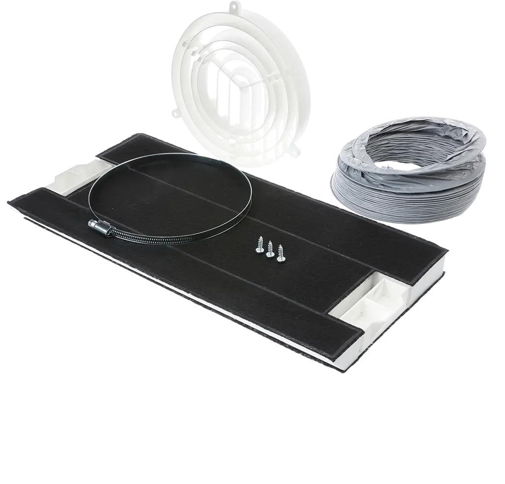 Filtro de carbón activo, pieza desviadora de aire, tubo flexible y 2 bridas.