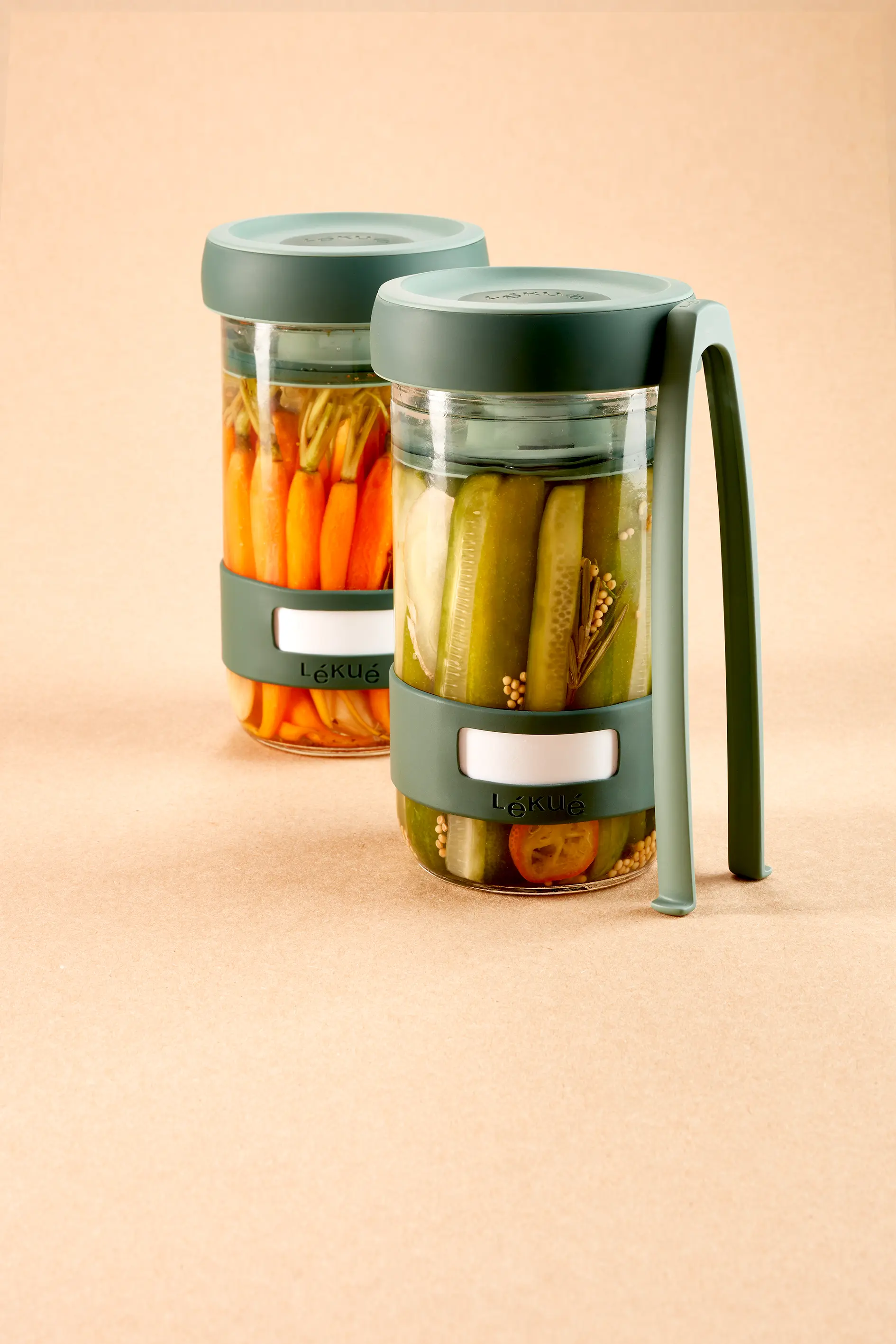 El kit incluye: 2 tarros de vidrio con tapa, 2 discos para prensar, 1 pinza y 1 recetario.